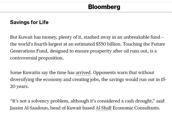 由于每年科威特卖石油收入的10%都会注入到该基金中,目前该基金的规模已经高达5500亿美元。彭博社称,科威特方面如今已经开始在动用这笔钱,去缓解其财政赤字的问题了,同时该国国会也决定在今年暂时不再将石油收入的10%注入该基金中。可该国也有不少反对这么做的人,他们担心如果只是这么吃“老本”,而不是赶紧想办法推动经济改革,消除对于能源的过度依赖,多元化经济来源和创造新的就业岗位,那么这个5500亿的“老本”要不了20年就会被吃完。