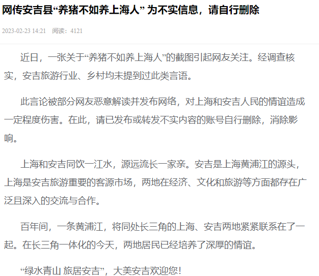 23日 ,一则“养猪不如养上海人”相关内容登上热搜,甚至被误读为“浙江安吉鼓励农户参加旅游业的口号”,但事实并非如此。 据安吉县委宣传部提供的一段发布时间是2022年9月10日的相关视频显示,这段视频中的主讲人是中国人民大学教授、三农问题专家温铁军。 来源:封面新闻 |
