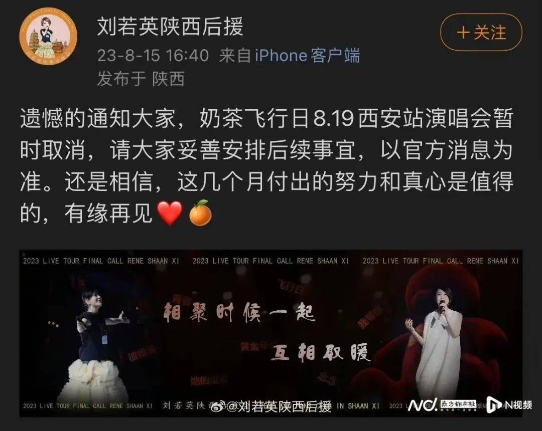 随后,名为“刘若英陕西后援”的账号也发出演出取消的通知:“遗憾地通知大家,奶茶飞行日8·19西安站演唱会暂时取消,请大家妥善安排后续事宜,以官方消息为准。还是相信,这几个月付出的努力和真心是值得的,有缘再见。” 该消息一出,引发热议,当中不乏已经订好机票和酒店的消费者表示强烈的不满。随着话题发酵,首先发出消息的“刘涵cello”通过开启“一键防护”模式,关闭了评论功能和转发内容的展示。“刘若英陕西后援”也删除了通知演出取消的微博。
