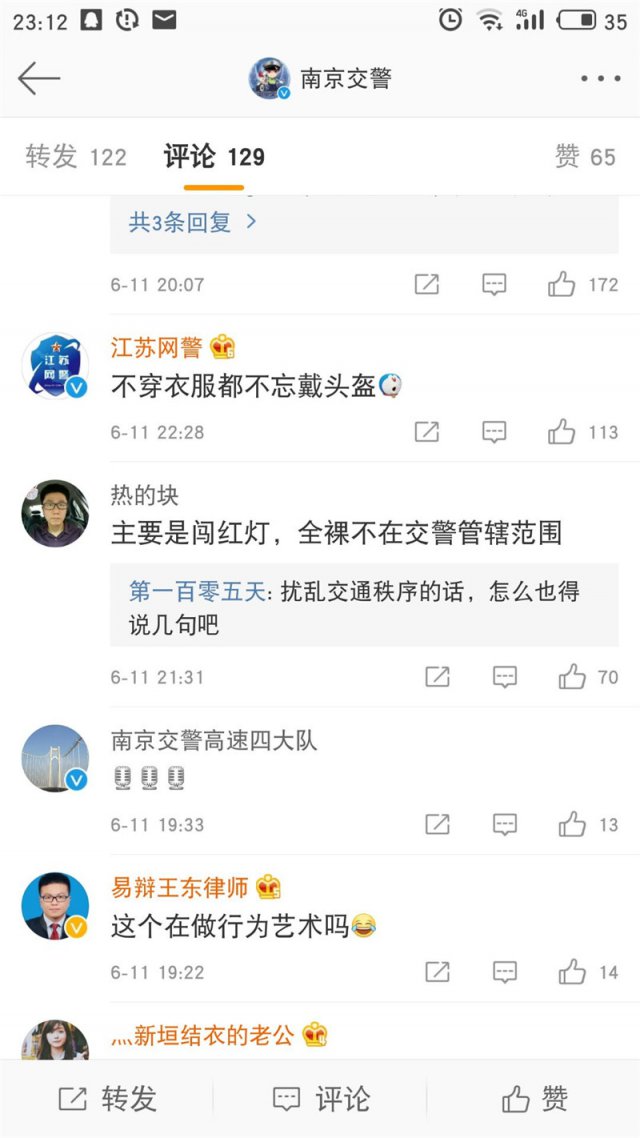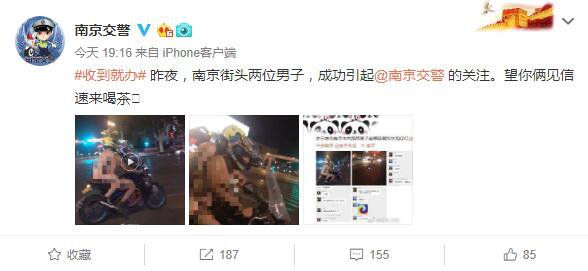 6月11日中午11点25分左右,有网友在微博上向南京交警举报,称10 日夜里,有两名男子在中央路全裸骑摩托车闯红灯。 现代快报记者获悉,收到举报信息后,南京交警部门已通过微博表态,称两位男子已经成功引起了 @南京交警 的关注,"望你俩见信速来喝茶。" 记者从图片上看,两人虽然没穿衣服,但是戴着头盔,穿着鞋子。画面被南京交警官方微博发布后,立即引发广大网友的关注和热议,看到微博后纷纷发出疑问,"难道这两人是在做行为艺术吗?!" |