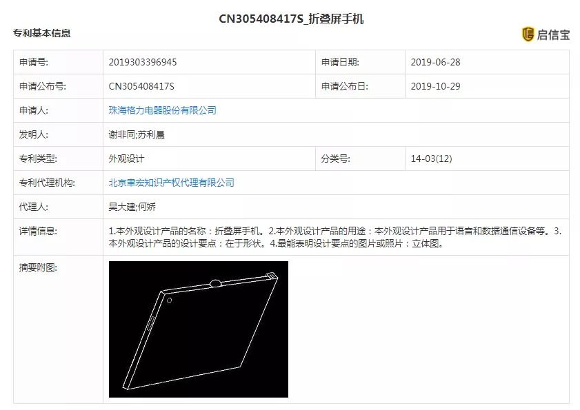 值得注意的是,启信宝显示,10月29日,珠海格力电器股份有限公司新增折叠屏手机专利,专利摘要包括:1.本外观设计产品的名称:折叠屏手机;2.本外观设计产品的用途:本外观设计产品用于语音和数据通信设备等;3.本外观设计产品的设计要点:在于形状;4.最能表明设计要点的图片或照片:立体图,该专利的法律状态以及法律状态信息均为授权。