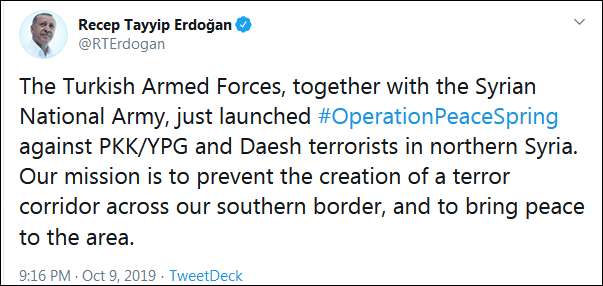 白宫突然宣布从叙利亚北部撤军,并允许土耳其在此采取行动,惹怒国会两党。不到一天,他又要求土耳其不要行动“过火”。 当地时间9日一早,特朗普再发推特为自己的撤军决定辩护,一会儿要土耳其接管极端组织“IS”战俘,一会儿又称美国在中东花了8万亿美元,卷入中东战争是“史上最遭决定”。 而就在特朗普发推后不久,土耳其总统埃尔多安发推宣布,针对叙利亚东北部的行动已经开始。 路透社拍摄的视频显示,土耳其支持的“叙利亚自由军”9日清晨抵达土叙边境 先来看特朗普的推特: “不同群体之间的斗争已经持续了数百年,美国不应该出现在中东,让我们的50名士兵撤离。土耳其必须接管那些欧洲国家不愿接回去的IS战俘。对我们来说,愚蠢的无休止的战争正在结束。” “美国已经在中东地区花了8万亿美元用于作战和维持治安,我们有成千上万伟大的士兵受伤或死亡,对方也有数以百万计的人死亡。卷入中东战争是美国有史以来最糟糕的决定!” “我们在现在已经被证实是错误的前提——大规模杀伤性武器下发动战争,那里并没有!现在我们正在缓慢而谨慎地把我们伟大的士兵和军队带回家,我们关注的是大局,美国比以往任何时候都强大。” 话音刚落,埃尔多安在推特上宣布,土耳其正规军已经与土耳其支持的叙利亚反对派武装“叙利亚国民军”一道,发起代号为“和平喷泉”的军事行动。 埃尔多安称,行动针对库尔德武装“人民保护力量(YPG)”,目标是消除针对土耳其的恐怖威胁,建立一个安全区以安置叙利亚难民。 法新社估计,美国在包括阿富汗、伊拉克和叙利亚在内的美军中央司令部覆盖的中东地区,拥有6万至8万名士兵。 观察者网此前报道,美国总统特朗普与土耳其总统埃尔多安6日就叙利亚问题通了电话,随后白宫发布“撤军”声明,并允许土耳其在此“采取进一步的长期行动”。 话音刚落,各方抨击接踵而至,面对土耳其的虎视眈眈,被视为美国“盟友”的库尔德武装痛批美国“背后捅刀”;美国国会两党也“统一阵线”,众议院议长佩洛西要求特朗普收回撤军决定,称这是向伊朗、俄罗斯,以及美国的盟友发出“美国不再可靠”的信号。 参议院共和党领袖麦康奈尔则称,仓促撤军只会令俄罗斯、伊朗、阿萨德政府获益。法国政府也警告,撤军会增加极端组织“伊斯兰国”卷土重来的风险。 当地时间7日晚,特朗普在推特上就叙利亚问题警告土耳其:“正如我之前的强硬表态,再重复一遍,如果土耳其采取了在我伟大与无人能及的智慧看来越界的任何行为,它的经济将被彻底摧毁与消灭(我以前就这么干过!)” 来源:观察者网 |