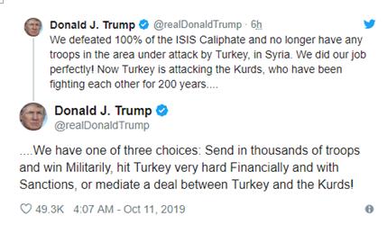 特朗普在推特提及土耳其对叙利亚库尔德武装的军事行动并提出三个选项。 报道提到,特朗普发表这则推文之际,他正面临美国内部来自共和党及民主党的一致“炮轰”,认为他“背叛”库尔德人以及为土耳其的军事行动开了绿灯。过去几年,库尔德武装一直是美国打击极端组织“伊斯兰国”(IS)的重要盟友,1.1万库尔德人在与IS的战斗中丧生。 10月6日,土耳其总统埃尔多安与特朗普通电话,就在叙建立“安全区”交换了意见,美国白宫当天表示,美军方不参与土耳其对叙利亚北部展开的军事行动,将会撤出相关区域,对军事行动“不支持、不参与”。特朗普为撤军决定辩解,说他的最终目标是兑现竞选承诺,即美军撤离“战事永无止境”的中东地区。 土耳其随后在10月9日宣布,土耳其军队及其支持的叙利亚反对派武装对叙北部的库尔德工人党展开代号为“和平喷泉”的军事行动,土耳其军队对叙利亚边境小镇展开空袭。叙利亚外交部9日强烈谴责土耳其的入侵行为,表示将用一切合法手段对抗土耳其。叙政府还表示,库尔德武装要为此负责,因为这些后果是他们依赖美国政府造成的。担心IS卷土重来的欧洲国家也纷纷谴责土耳其的军事行动。 来源:环球网 |