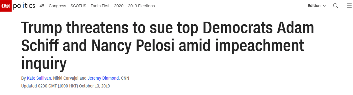 随着针对美国总统特朗普的弹劾调查逐步深入,特朗普开始进行“反击”。据美国有线电视新闻网(CNN)报道,特朗普12日威胁要起诉众议院情报委员会主席亚当·希夫和众议院议长南希·佩洛西。 (特朗普。图源:CNN) 报道称,长期以来,特朗普一直呼吁对他的批评者提起诉讼,但都没有付诸行动。特朗普12日在一次活动上发表讲话时称,“我们要看看。我们要追查这些人。他们是非常坏的人。” (CNN报道截图) 特朗普表示,他已和律师沟通,并告诉他们要对希夫和佩洛西提起诉讼。“无论如何都要起诉他(希夫),即使我们输了,美国公众也会理解的,”特朗普称,“还要起诉佩洛西,也许我们应该弹劾他们,因为他们在撒谎。他们的所作所为对我们的国家来说是一件可怕的事情。” 报道中提到,目前,希夫正在带头进行弹劾调查。而根据美国宪法,国会议员不能被弹劾。 特朗普的律师杰伊·塞库洛告诉CNN,在特朗普提出起诉可能之后,总统的法律团队正在“着眼所有选择”。“没有什么是不可能的”,塞库洛在给CNN的一条短信中称,目前他们正“处于研究阶段”。CNN认为,这暗示白宫不会立即采取法律行动。 “这次(弹劾)调查中,(调查)模式和做法的不规范让人想起穆勒调查中的杂乱无章,”塞库洛说,“任何总统都不应该受到这种政治戏剧的支配。” 美国一名情报界人士今年8月检举特朗普在与乌克兰总统泽连斯基的电话通话中以军事援助为筹码施压对方调查拜登父子,特朗普政府随后阻拦国会知悉相关情况。这一“电话门”事件震动美国朝野。 民主党人指责特朗普滥用职权谋求个人利益以及寻求外国势力干预美国总统选举。佩洛西9月24日宣布,众议院将启动针对特朗普的弹劾调查。在舆论压力下,美国白宫25日公布特朗普与泽连斯基今年7月一次电话通话的记录。 10月8日,白宫法律顾问西波隆致信众议院议长佩洛西称,特朗普本人及其团队不会配合众议院发起的弹劾调查,并强调弹劾调查是“毫无根据”、“在宪法上无效的”。此举被《纽约时报》解读为“白宫向弹劾调查宣战”。 来源:环球网 |
