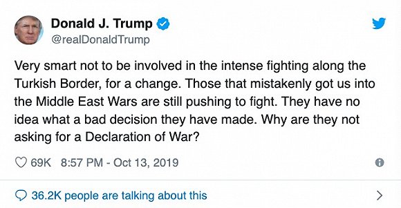 特朗普本人也在13日连发数条推特称,他不会允许美国介入土耳其和库尔德的长期斗争中,这是一个“聪明”的决定,但美国会密切关注形势发展。