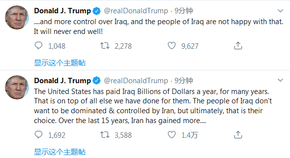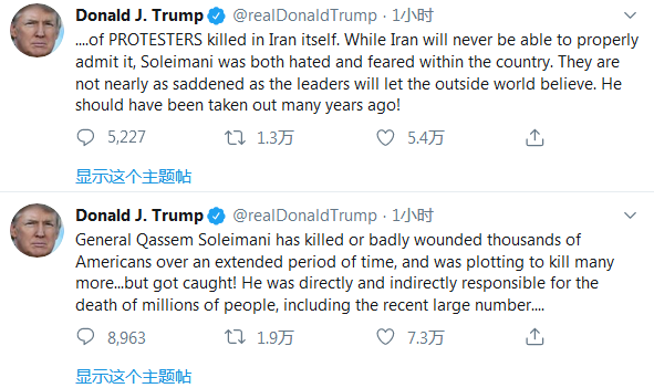 【此前报道:快讯!特朗普连续发推谈杀死伊朗将军:他很多年前就该被干掉】