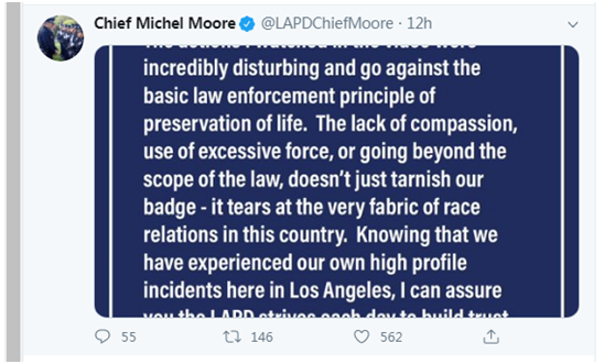 事后,洛杉矶警察局局长米歇尔•摩尔(Michel Moore)也在推特上发表声明称,“我在视频中看到的行为令人难以置信地不安,违反了保护生命的基本执法原则。”