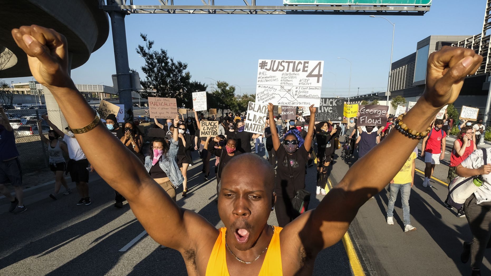 有视频画面显示,一些示威者一度冲上高速公路阻拦交通并与警察巡逻车对峙,洛杉矶警察局还发布警报。报道称,有示威者敲打试图穿过人群的警察巡逻车的引擎盖,有人似乎用滑板砸坏了警车的后玻璃。
