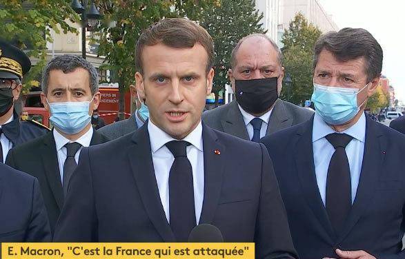 法国南部城市尼斯在当天上午发生一起持刀恐袭案,造成3人死亡。马克龙当天下午抵达尼斯,在事发教堂前与参与活动处置的警察、救护人员交流,了解事发时情况。在稍后的对媒体讲话中,马克龙向三次遭受恐怖袭击的尼斯市和民众表示支持和慰问,同时强烈谴责当天上午发生的是一起“伊斯兰恐怖袭击”。马克龙同时表示,将动用更多的军队力量执行安保任务,目前在反恐行动“哨兵计划”下的3000名兵力提高到7000名。此外,法国将加强对宗教场所的警戒力度。