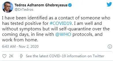 据外媒报道,当地时间11月1日,世卫组织(WTO)总干事谭德塞称,他已确认与新冠患者接触,将进行自我隔离,并补充说,自己感觉良好,没有任何症状。