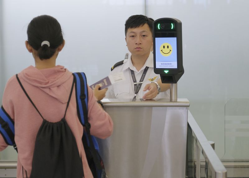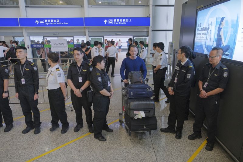 8月14日,在香港国际机场,旅客经安保人员检查后进入机场。新华社记者 王申 摄