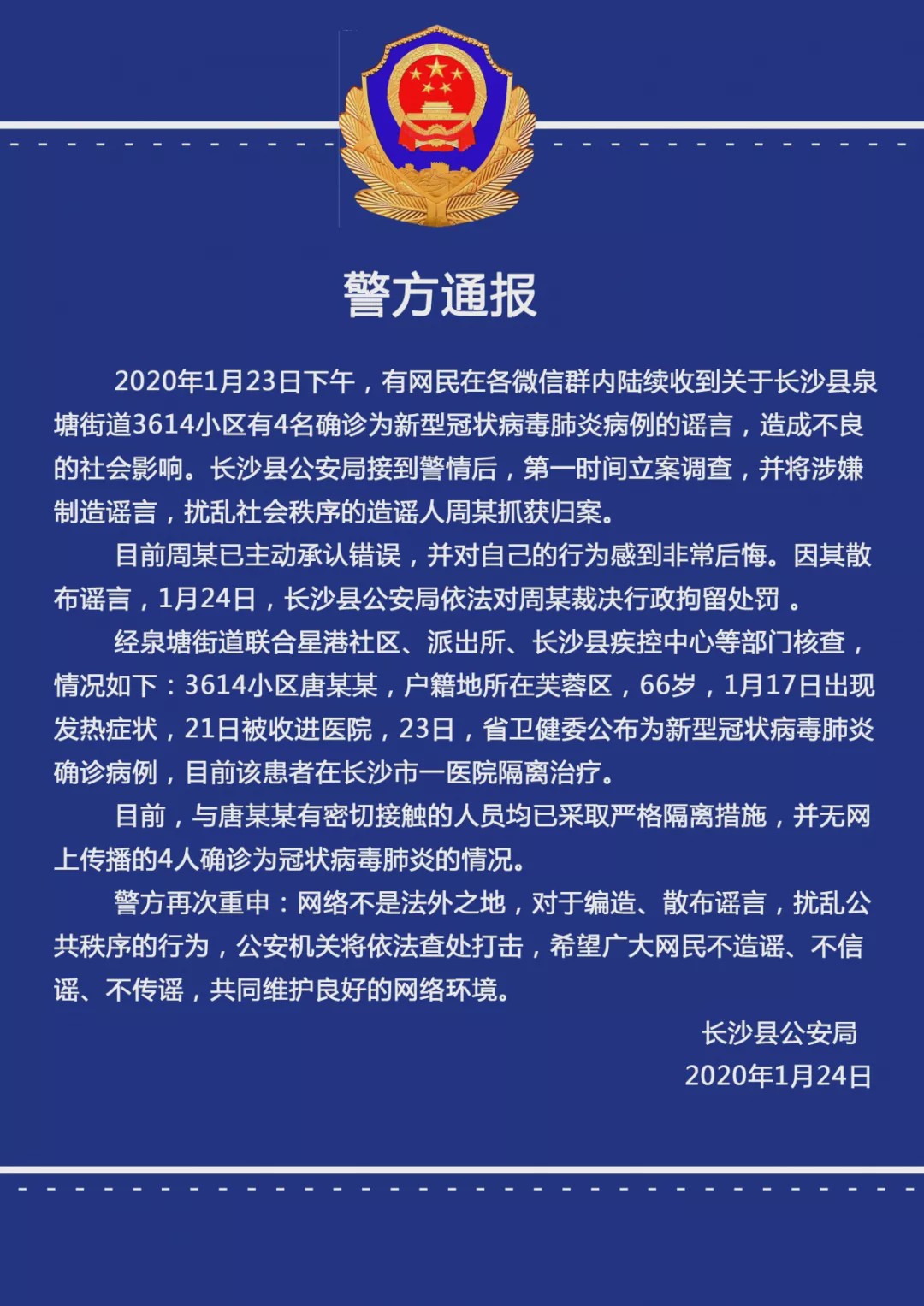 湖南长沙网民称小区有4名肺炎病例被拘留 警方:造谣的!仅有1例