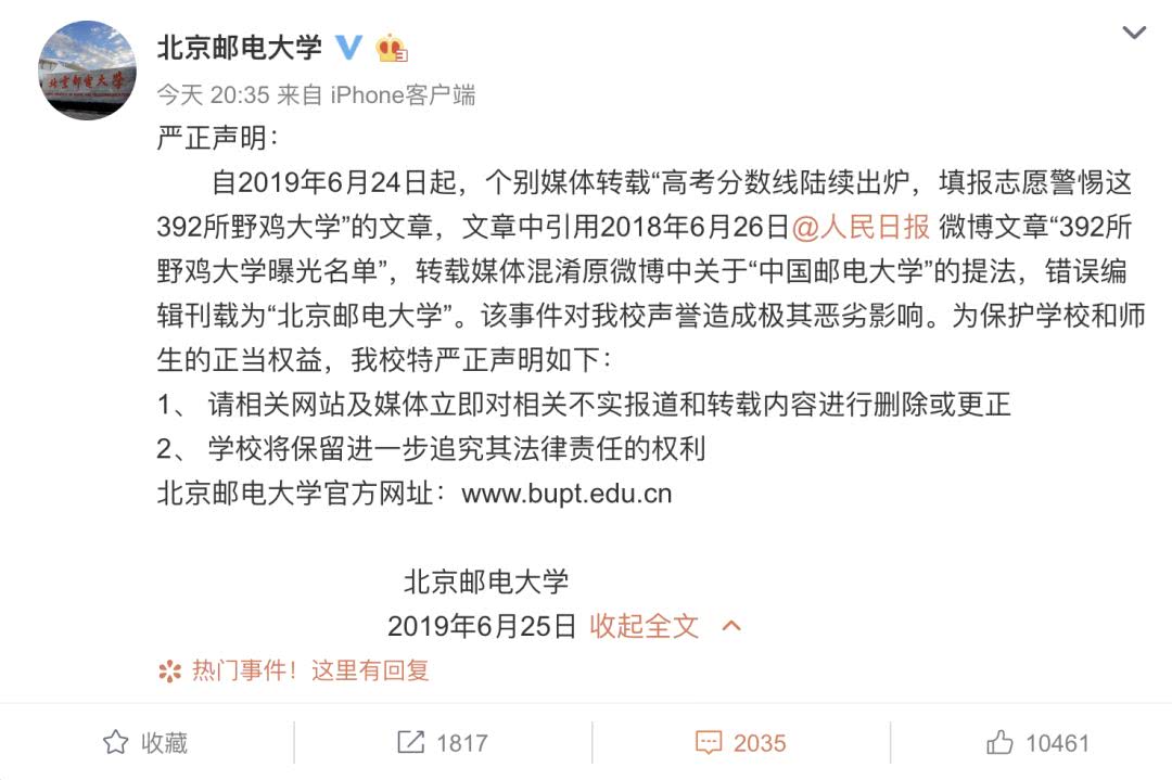 自2019年6月24日起,个别媒体转载“高考分数线陆续出炉,填报志愿警惕这392所野鸡大学”的文章,文章中引用2018年6月26日@人民日报 微博文章“392所野鸡大学曝光名单”,转载媒体混淆原微博中关于“中国邮电大学”的提法,错误编辑刊载为“北京邮电大学”。该事件对我校声誉造成极其恶劣影响。为保护学校和师生的正当权益,我校特严正声明如下: