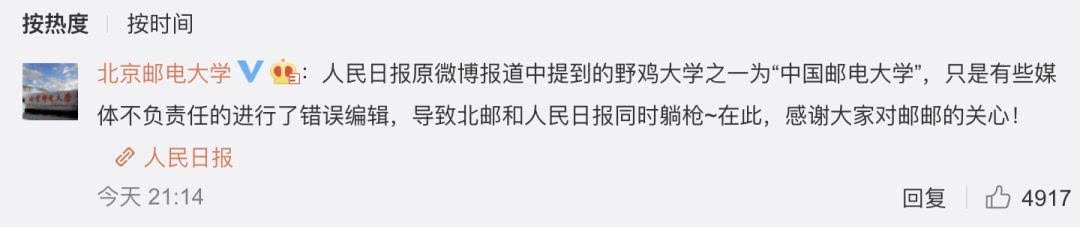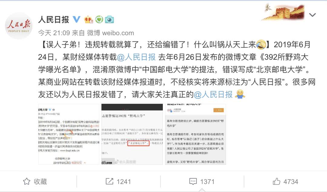 回应称,2019年6月24日,某财经媒体转载@人民日报 去年6月26日发布的微博文章《392所野鸡大学曝光名单》,混淆原微博中“中国邮电大学”的提法,错误写成“北京邮电大学”。某商业网站在转载该财经媒体报道时,不经核实将来源标注为“人民日报”。