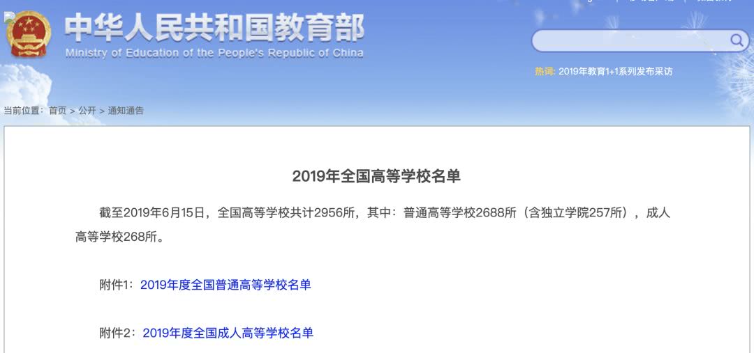 据教育部新闻办消息,今年6月,教育部发布了2019全国高校名单。