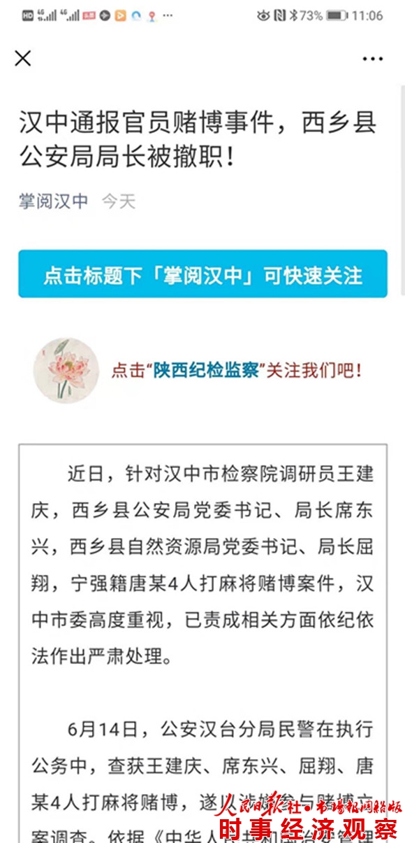 6月14日,公安汉台分局民警在执行公务中,查获王建庆、席东兴、屈翔、唐某4人打麻将赌博,遂以涉嫌参与赌博立案调查。依据《中华人民共和国治安管理处罚法》,公安汉台分局作出处罚决定,对4人各处行政拘留十日、并处罚款。 依据《中国共产党纪律处分条例》《中华人民共和国监察法》等有关法规,经市纪委监委会议研究并报市委批准,决定给予王建庆留党察看一年、政务撤职处分;给予席东兴留党察看一年、政务撤职处分。屈翔已被市自然资源局免职,因其同时涉及其他问题线索,目前,正在由西乡县纪委监委并案调查。 据此前媒体报道,6月14日,汉中市西乡县公安局局长席东兴、西乡县检察院检察长王建庆、西乡县自然资源局局长屈翔等便来到位于汉中市劳动东路的田园酒店后楼赌博。当天中央督导组正好带领省市有关人员刚好来到酒店抓捕涉黑涉恶嫌疑人。抓捕时把门敲错了,进去就发现几个人正在赌博。当天是星期五,属于工作日,“扫黑除恶关键时刻,公安局长竟聚众赌博”,督导组相关人员说,在现场查获赌资3.8万元。 |