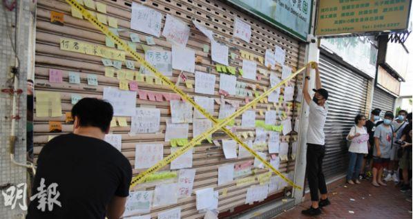 有人23日下午到何君尧位于屯门的议员办事处门口贴标语(图片来源:香港《明报》)