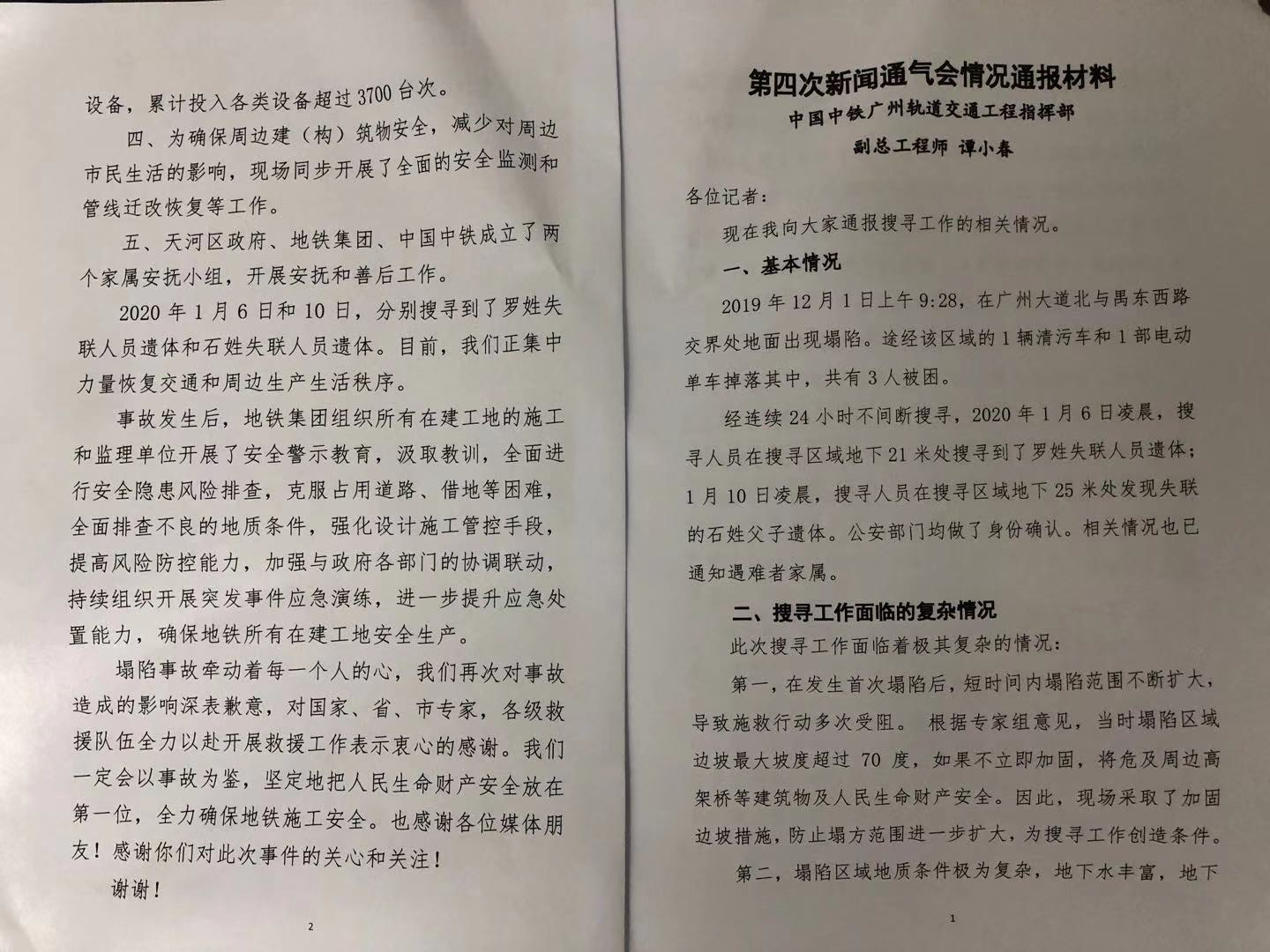 在1月11日的新闻通气会上,中国中铁广州轨道交通工程指挥部副总工程师谭小春介绍说,1月6日凌晨,搜寻人员在搜寻区域地下21米处搜寻到罗姓失联人员遗体;1月10日凌晨,在搜寻区域地下25米处,发现失联人员石姓父子遗体。公安部门均做了身份确认,相关情况也通知遇难者家属。