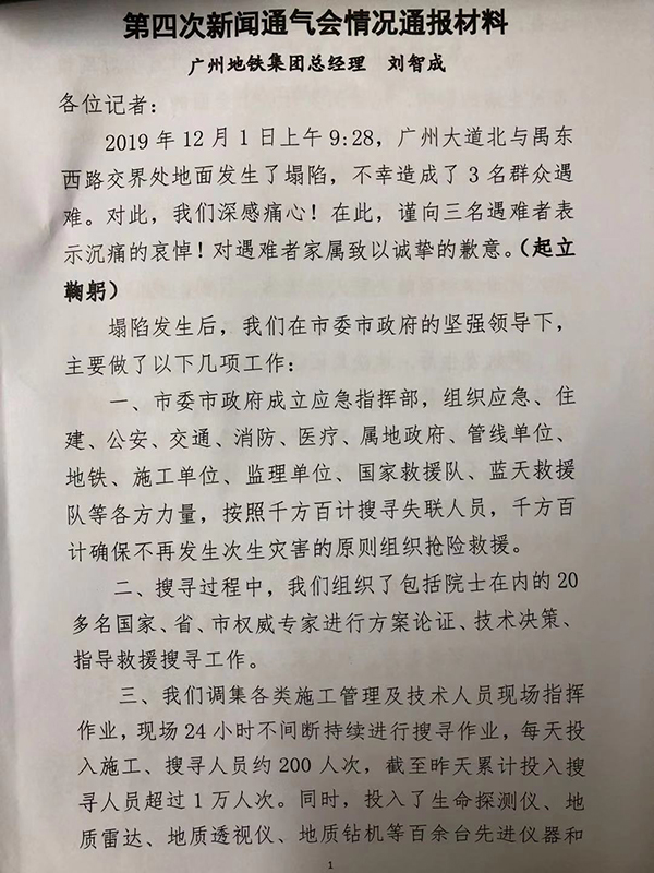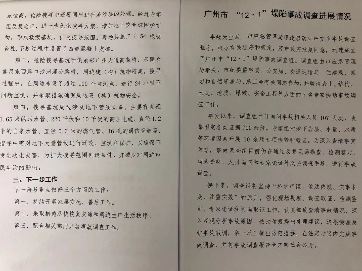 据通气会披露,事故发生后,广州市已成立“12·1”塌陷事故调查组。事发以来,调查组共询问事故相关人员107次,收集固定各类证据700余份,将会在法定时限内完成事故调查,并将事故报告全文向社会公开。