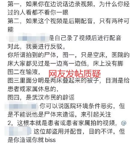有网友一眼就看出了视频中的端倪,所谓的“三具尸体”要么是正在打点滴的患者,要么是家属裹在床单下的被子……