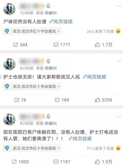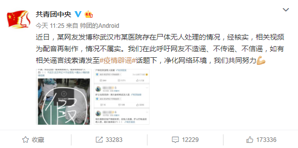共青团中央也发布了辟谣信息:近日,某网友发博称武汉市某医院存在尸体无人处理的情况,经核实,相关视频为配音再制作,情况不属实。我们在此呼吁网友不造谣、不传谣、不信谣,如有相关谣言线索请发至#疫情辟谣#话题下,净化网络环境,我们共同努力。