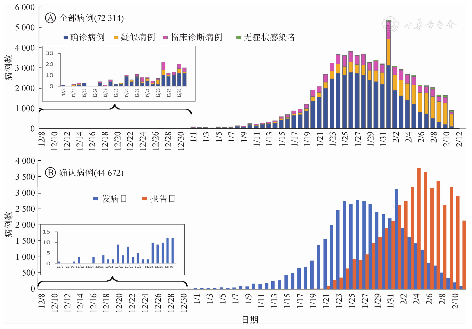 截至2020年2月11日新型冠状病毒肺炎确诊病例报告日期、发病日期流行曲线。图片来自《中华流行病学杂志》网站