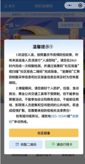 记者从市大数据局获悉,根据重庆市新型冠状病毒疫情防控政策关于“入渝即检”的相关要求,经过一段时间试运行,从8月27日0时起,“入渝码”将正式上线,所有从市外来渝返渝人员,均须扫“入渝码”。 目前,在我市机场、火车站、跨省长途汽车站、港口码头和高速公路下道口等交通口岸,张贴了“入渝码”图案。来渝返渝人员扫码后,按“入渝码”弹窗提示完成24小时内的1次核酸检测采样,并完成“社区报备”,弹窗消失。 示意图。最终显示效果以实际情况为准 据悉,弹窗期间,相关人员要做好个人防护,住宿、急诊救治、乘坐公共交通工具等不受限制,但不能参加聚餐活动,不能参加会议和商务活动,不能前往商场、影院等人员密集和空间密闭的公共场所。 |