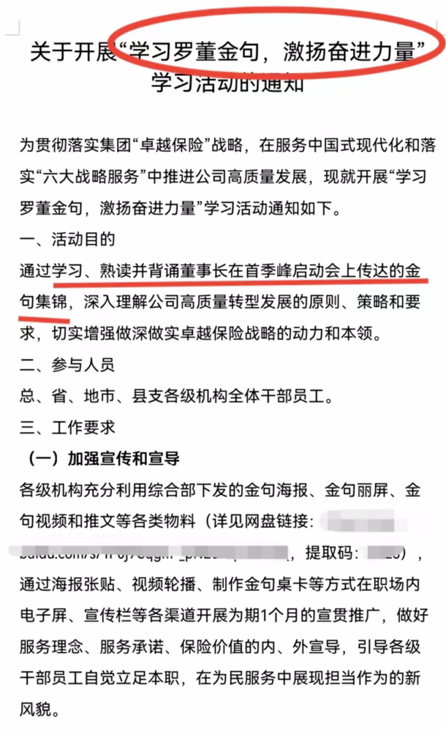据“人民保险”微信公众号17日消息,2023年2月17日下午,中国人民保险集团股份有限公司召开党委扩大会议。受中央组织部领导委派,中央组织部有关干部局负责同志宣布了中央决定:免去罗熹同志的中国人民保险集团股份有限公司党委书记职务。 澎湃新闻报道,就任职时间看,罗熹掌管中国人保(5.070,-0.02,-0.39%)前后不到2年半。 1月12日,中国人民保险集团在京召开2023年工作会议,罗熹主持会议并作题为《坚定信心发挥卓越保险作用》的讲话。会议认为,人保系统干部员工的精神面貌和作风士气发生了深刻变化,重回行业C位、跃居全球一流,已经成为系统上下的共同心愿。2023年,系统上下要深刻认识宏观政策导向、保险需求扩大、集团基础夯实三方面的有利条件,进一步坚定发展信心和战略定力,锚定卓越战略目标不动摇,以更加扎实的举措做实卓越保险战略,为建设全球一流保险集团不懈努力。 此前,据顶端新闻报道,中国人民保险集团股份有限公司旗下的人保寿险公司曾发布一项学习活动的通知。《通知》显示,要求公司总、省、地市、县支各级机构全体干部员工,“学习、熟读、并背诵董事长在首季峰启动会上传达的金句集锦。” 企业发文要求全员背诵董事长“金句”。 不仅如此,《通知》还要求,总公司各部门主要负责人、各级机构一把手要充分发挥示范带动作用,带头讲金句、用金句,通过集中学习、个人自学、背诵打卡等多种方式,确保全体内勤人员将金句内容牢记于心、付诸于行…… 《通知》中还提到,要在今年2月10日前,完成全员闭卷通关及考试,并对考试成绩进行汇总。“纸质试卷需妥善保管,以备检查。” |