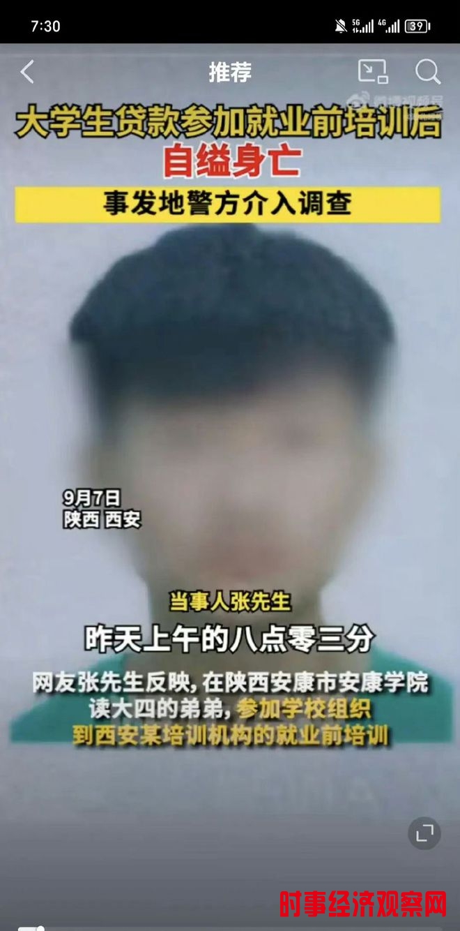 9月7日,陕西西安。网友张先生爆料,在陕西安康市安康学院读大四的弟弟,参加学校组织到西安某培训机构的就业前培训,因学费1万多元,家里拮据没同意,弟弟在培训机构推荐的小额贷款机构贷款参加培训后,于9月6日凌晨在西安雁塔区唐延路遗址公园内自缢身亡。张先生向湖北经视记者介绍,9月7日接到西安当地警方通知后,家人悲痛万分,弟弟本该在安康市安康学院就读,为何学校非要组织到西安一家培训机构异地培训,培训期间又为何会无故自缢。8日上午,安康学院江北校区一位教师表示,目前警方已介入调查处理,在调查结果未出来之前,其他事情一概只能等待官方通报。涉事的西安市雁塔区唐兴数码大厦千峰培训机构工作人员则回应称,西安市公安局高新分局唐延路派出所正在调查处理此事,其他不方便回应。