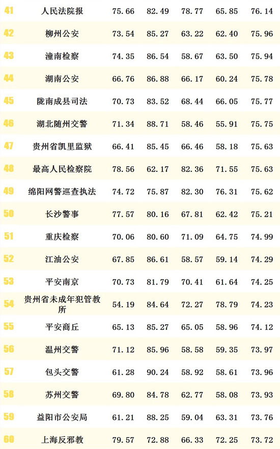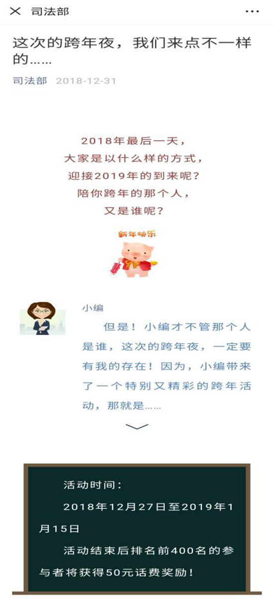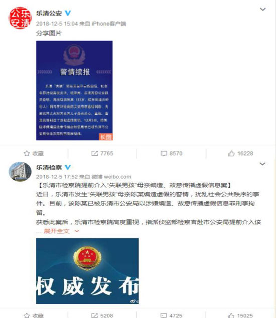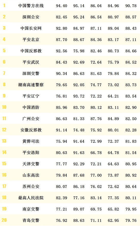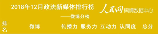 在前10名中,@中国警方在线(原@公安部打四黑除四害)更名后传播力、互动力均再获提升,以优异成绩稳居榜首;@深圳公安本月微博互动力与认同度明显提高,跃居榜单第二名;@中国长安网紧随其后,名列第三。按领域来看,本月公安系统仍旧表现突出,占据榜单前十名中的八席,其中,@平安武汉、@湖南高速警察、@平安辽宁传播表现均实现较大飞跃。 “一串令人落泪的数字”掀起致敬热潮,中国长安网发布年度照片打动万千网民 2018年12月,中国长安网开设的微博话题#一串令人落泪的数字#震动网络舆论场,该话题以高达5700余万次的阅读量强势登上热搜榜。话题下,@中国长安网公布的一组政法干警牺牲信息“十八大以来,法院系统牺牲119人,检察系统牺牲65人,公安系统牺牲2061人,司法行政系统牺牲286人……”引发政法系统工作者强烈共鸣。不少网友感慨,在和平的年代里,正是这些人的“负重前行”,才有黎民百姓的“岁月静好”,要沉痛缅怀这些逝去的英雄,向他们致敬。整体来看,中国长安网借力年底节点,多渠道开展温情传播,进一步塑造了政法工作者尽忠职守、竭诚为民的良好形象,有力增进了公众对政法工作的理解和支持。同月,中国长安网2018年度照片评选活动启动。活动从面向全国征集的几千张记录政法干警辛勤履职的摄影作品中,初步筛选出50张年度候选作品,邀请网民通过中国长安网PC端、中国长安网APP端、“中央政法委长安剑”微信公众号和中国长安网官方微博四种途径进行投票。参与评选的一系列照片定格政法干警顽强拼搏的精彩瞬间,凭借强烈的视觉冲击力和艺术感染力打动万千网民。截至活动结束,共有超1.3亿人次访问活动页面,众多网民共参与投票4300余万次。最终,20张最具震撼力、感召力、影响力的新闻照片被评选成为中国长安网年度照片,其中,《父亲的敬礼》等作品更在微博上刷屏式传播,触动广大网民泪点。 图:话题#一串令人落泪的数字#登上微博热搜榜 1分钟朗读宪法“传播法治正能量”,全国法院同频共振推动宪法精神深入人心 2018年12月4日至9日,“宪法宣传周”期间,@最高人民法院联同@中国长安网、@最高人民检察院等在新浪微博发起“国家宪法日”“我是宪法朗读者”等网络传播活动,号召网民发挥创意拍摄1分钟左右的朗读宪法视频,以宣扬宪法精神,传递法治正能量。众多地方法院、检察院官方微博踊跃参与,带动一众网友形成朗读宪法的学习热潮,助推相关话题阅读总量超过3亿。与此同时,活动在抖音平台上也表现亮眼。抖音号“中国法院网”发布多条朗读宪法活动视频,点赞量累计超1万人次。北京西城法院、浙江杭州法院、浙江金华法院、黑龙江鸡西法院、山东临沂兰山法院等地方法院也矩阵联动,通过官方抖音号发布各具特色的剪辑视频,进一步助推形成全民尊法学法守法用法的良好舆论氛围。 图:@最高人民法院、@最高人民检察院、中国长安网共同发起#国家宪法日#等网络传播活动 乐清儿童失联案一波三折引热议,警检联动有序发声满足舆论关切 2018年11月30日晚,一则主题为“浙江乐清一名男孩‘失联’”的消息开始在网络散播,引发网友围观。12月3日,浙江省乐清市公安局官方微博@乐清公安发布寻人启事,表示失联男孩仍未找到,呼吁广大市民积极提供有效线索。该条微博很快受到舆论高度关注,转评赞总量接近3万,众多网民及公益“大V”帮助扩散传播有关信息。但与此同时,“失联男孩已被杀害”“乐清出现人贩子”等谣言也开始在网上滋生。12月4日,@乐清公安再发微博,对上述谣言一一辟谣,及时震慑不法行为。12月5日凌晨,@乐清公安第三次发声,表示失联男孩已找到,对社会各界的关心和支持表示敬意,但同时称,此次事件是其家属故意制造的虚假警情。当日下午,@乐清公安动态续报,表示男孩母亲陈某因与在外经商的丈夫存在感情纠纷,为测试丈夫对儿子是否关心,遂策划制造了虚假警情,乐清市公安局已将其依法刑拘。两条微博转评赞总量突破9万,众多网民表达了对涉事母亲消费公众爱心的愤怒和不满,呼吁严惩。对此,@乐清检察很快通过官方微博发声,表态检方已提前介入该案、引导侦查取证,及时回应舆论关切,稳定舆论情绪,相关微博获赞1.5万余次。12月14日,@乐清检察正式通报,犯罪嫌疑人陈某已被批准逮捕,网民纷纷对此表示“大快人心”,称赞警检及时联手对严重透支社会诚信的恶劣行径做出了警示,有力激浊扬清、助推了良善社会风气的形成。 图:警检联动应对“失联男孩”母亲编造、故意传播虚假信息案 四平警事“抖音小剧场”一夜爆红,创新普法内容轻阅化传播 2018年12月,抖音号“四平警事”发布的一则视频短剧成功“捧红”了两个“抢劫犯”。短片中,102国道的“张道长”和“吴书记”拦路劫车却劫到一辆警车,成功被警察“抓包”,逗笑之余,剧中的“董队长”不忘科普:“涉嫌拦路抢劫将被处以三年以上十年以下有期徒刑”。该条视频的传播很快在网上呈现刷屏之势,吉林省四平市公安局官方抖音号“四平警事”也一夜爆红。而事实上,自2018年6月正式上线后,“四平警事”已先后推出百余条短视频作品,其中,由导演张浩、四平当地主持人吴尔渥,以及四平市公安局网络宣传辅警董政主演的系列“普法小剧场”深受广大网民喜爱。此次最新短剧受到全网热捧后,“四平警事”再次圈粉无