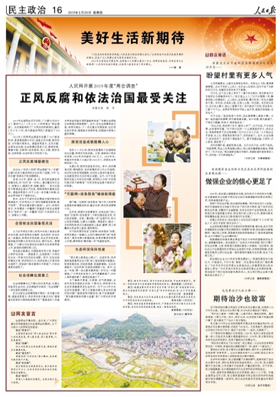《时事经济观察》3月4日综合讯 东风送暖,春回大地。3月,一年一度全国两会召开,共商发展大计,举国高度瞩目。 解决“新官不理旧账”、消除奇葩证明、缓解“大城市病”、严惩暴力伤医、治理校外托管乱象、提速降费……每年两会,总有一些话题“脱颖而出”,引来广泛热议。 今年两会哪些话题最热、网民最关心?人民网将充分运用大数据作为参考依据,捕捉两会热点,解读背后世情。 “两会热1℃”系列报道,带你到两会热点里面瞧门道。 2019人民网两会调查热词排行 又是一年春天到,又到一年两会时。 作为每年全国两会召开前的预热报道,人民网两会调查已连续推出18年。从2月12日至3月1日,2019年的两会调查共吸引450万人次参与,网民参与度再创新高。 经过投票,正风反腐、依法治国、社会保障在18个候选热词中高居前三,教育改革、健康中国分列第四、第六。在今年新增的候选热词中,“互联网+政务服务”最受关注,排名第五;“社会治理”位列第十。 十大热词,多与百姓的获得感、幸福感、安全感息息相关。天蓝水净、保障到位、收入增加、教育公平、吃得放心、住得安心……两会调查汇聚广大网民心声,呼唤更多“看得见的幸福”。 “反腐”连续3年成最热词 今年,正风反腐登上热词榜榜首。这已经是“反腐”连续第三年成为两会调查最热词。 细数人民网历年两会调查,“反腐”均位列热词榜“上位圈”。在过去17年的“两会调查”中,“反腐”议题8次成为最热话题。 回眸2018年,党中央持之以恒全面从严治党,以零容忍态度严惩腐败,正风反腐领域大事不断。调查显示,39%的网民关注“继续重拳打虎,一批高官落马”;18%的网民关注“反‘四风’进一步深入,重点整治形式主义、官僚主义”;15%的网民关注“国家、省、市、县四级监察体系组建完成”。 另据人民网舆情数据中心提供的数据,在对3000家纸媒和4万家网媒的报道进行分析后发现,2018年有关反腐的报道高达135万余篇,舆论关注度持续处在高位。 打赢正风反腐这场硬仗,离不开群众的监督和参与。 应对基层干部以下哪些行为提高警惕?在回答这一问题时,31%的网民选择“充当黑恶势力‘保护伞’”。此外,有22%的网民认为是“吃拿卡要、雁过拔毛等以权谋私行为”,21%的网民选择“‘四风’尤其是形式主义、官僚主义行为”。 “像去年发生的‘严书记被查’事件,就是官方与舆论围绕反腐进行良性互动的典范,不仅显示了公众舆论是反腐重要的民间力量,还展现了反腐工作在接纳舆论监督方面的高度开放性。”人民网公共政策研究员熊剪梅介绍。 “反腐最得民心,且永远在路上”“打击黑恶势力‘保护伞’,反腐败势在必行”“加大基层反腐力度,尤其是县乡村三级”“加大对群众身边腐败现象的惩治力度”……网友纷纷留言称快。 依法治国关注度跃升第二 在今年,依法治国排名大幅提升,跃居热词榜次席。 2018年的两会调查中,依法治国在18个候选热词中仅排名第九,2017年则排在第八。 对于2018年发生的法治领域事件,近四成网民关注“在全国开展扫黑除恶专项斗争”,比例最高;“《中华人民共和国宪法修正案》通过”也收获26%的高关注度。 十八届四中全会明确提出,切实解决执行难,依法保障胜诉当事人及时实现权益。对于全国法院近年来出台的相关举措,27%的网民关注“建立网络执行查控系统”,18%的网民关注“加大对失信被执行人的曝光力度”,15%的网民关注“加强对失信被执行人的信用惩戒”,14%的网民关注“依法对失信被执行人启动刑事追责或司法拘留”。 “盼望早日解决执行难”“加大力度追讨老赖赖账”“加大对老赖惩处力度”“严打老赖要决不手软”“老赖必须抓”……“肥牛二号”等网友留言强烈呼吁。 近年来,法治政府建设扎实推进。调查显示,公职部门更讲诚信、行政决策更加规范合法、政府信息公开更加阳光透明最受网民认可,分别获得19%、18%和17%的选择。 党的十八大以来,党中央深入推进全面依法治国,始终坚持法治国家、法治政府、法治社会一体建设,取得历史性成就,越来越多的群众自觉关注法治、践行法治。 “2018年,高铁霸座、校园暴力、信息泄露等舆情事件频发,网民借此呼吁完善诚信体系、未成年人保护、信息安全保障,有力地推动了法治进步。”熊剪梅说。 腾讯指数中的网民情绪值显示,网民对全面依法治国的正面情绪高达83%,位列所有话题第一,这正是网民信心和期待的直接体现。 呼唤更多“看得见的幸福” 党的十九大胜利召开,开启了以人民为中心、迈向美好生活的新征程。社会保障、教育改革、收入分配、脱贫攻坚、健康中国、住房制度、社会治理、生态环保等话题,同样在今年两会调查中备受关注。 社保领域改革牵动民心。30%的网民关心“提高基本医保和大病保险保障水平”。对于政府在民生兜底方面的工作重点,各有22%的网民选择“发展居家、社区和互助式养老”和“提高城乡低保标准”。 在教育改革的分调查中,“中小学生减负”最受关注。对于如何促进教育公平、提升教育质量,近半数网民认为应进一步缩小城乡、区域、学校之间差距以及加强师资队伍和师德师风建设。 近半数网民建议,收入分配改革应在“扩大中等收入群体收入、调节过高收入和增加低收入者收入”方面重点发力。 广大网民关心脱贫攻坚工