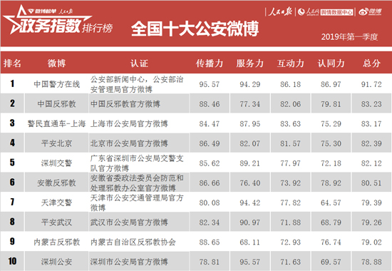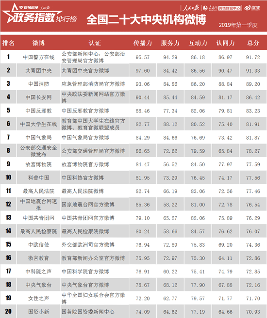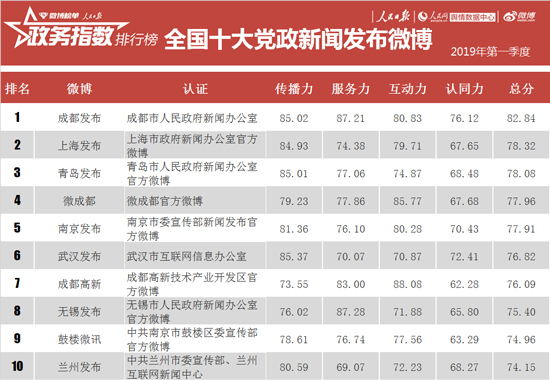本网5月29日综合讯 人民日报发布“2019年一季度政务微博影响力排行榜”,排行榜由人民网舆情数据中心制作,微博提供数据支持,评价对象包括全国所有通过微博认证的机构官方微博,评价体系包括四个维度:传播力、服务力、互动力和认同度。数据统计周期为2019年1月1日至2019年3月31日。“政务微博影响力排行榜”旨在促进网络政务信息传播力的全面提升,促进政务机构服务力的提升,促进网络政务互动力的提升。 一季度,@中国警方在线、@共青团中央与@中国消防领跑政务指数微博影响力排行榜,引导全国政务微博健康向上发展,并携同@中国长安网、@中国反邪教、@中国大学生在线、@中国气象局、@公安部交通安全微发布、@故宫博物院、@科普中国荣获全国十大中央机构微博。@中国警方在线、@共青团中央、@中国消防、@中国长安网、@气象北京分别夺得公安、团委、应急管理、政法委、气象等分榜的桂冠。 政务微博地区发展格局继续保持平稳。一季度各省份政务微博竞争力排行中,排名前五的分别是四川、江苏、安徽、山东、广东。与2018年一季度相比,甘肃表现亮眼,上升10个名次,位列第11名。从各省份拥有的百强账号数量可以看出,四川、山东、广东、安徽等地拥有的百强账号相对较多,四川和山东各有9个账号进入百强,广东和安徽分别有8、7个账号入榜。城市方面,成都蝉联城市政务微博竞争力冠军,青岛、深圳分别较2018年一季度分别上升6、4个席位,跻身城市政务微博竞争力前十。四川、安徽各有12个城市进入城市政务微博竞争力排行榜百强,山东、江苏、浙江也分别有10、9、8个城市入围,同样有不俗表现。(叶德恒) 一季度排名情况详见报告: 附:重要行业分榜 |