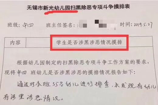本网5月31日综合讯 5月28日,一张《无锡市新光幼儿园扫黑除恶专项斗争摸排表》的图片在网络热传,图中表格汇报栏写道:“通过对本班35名幼儿进行排查,未发现幼儿有涉黑涉恶情况。”表格抬头,还附有两名班主任老师的签名。该图片被网友纷纷转发,引起广泛质疑。 图片来自网络 扫黑除恶指向的对象,竟波及到了还在上幼儿园的孩子?正当网友猜测网传图片是否有PS恶搞之嫌时,官方回应却让人大跌眼镜:此事属实。 28日下午,当地向媒体回应:此事应属于校方在信息传递中出现错误。按照教育部门要求,辖区学校进行扫黑除恶专项斗争线索摸排,旨在排查各学校是否有校园欺凌现象,并及时消除。该幼儿园忙中出错,在向教师传递信息时出现偏差,导致此事件的发生,区教育局已要求校方整改并吸取教训。 面对如此回应,不少网友仍保持质疑态度,网友@心心点yxx称,“只要看过图片的人只怕都有感慨,这也太违背常识了!扫黑除恶怎么都不可能联想到幼儿身上!”@小双等风来说,“总觉得像在开玩笑,确定不是在完成指标任务吗?”更有网友调侃,“是不是玩具枪要被没收了?看来以后扫黑除恶都要从娃娃抓起。” 黑恶现象和校园欺凌现象,是性质不同的两类情况,当地有关部门是真的混淆不分还是在搪塞舆论质疑?我们不得而知。对此,《新京报》直言,“将校园欺凌和黑恶势力这两项风马牛不相及的社会现象混为一谈,这不仅是语文没学好,而是生活常识课都不及格。前不久全国扫黑办举行专题调研座谈会,结合当下的扫黑除恶工作,提出了要预防‘6个苗头’的要求。其中之一就是随意定性、乱贴标签的问题,而将校园欺凌跟扫黑除恶等同,也有随意定性之嫌。” 前有将医生列入黑心企业的打黑宣传册,后有幼儿纳入扫黑除恶排查对象的摸排表。看似荒谬,却暴露了个别基层敷衍了事、形式主义的作风。界面新闻评论指出,“基层把有限的精力耗费到了无意义的工作中,普遍撒网敷衍任务的同时,也就意味着放弃对重点对象的关注。连幼儿园都去摸排的工作人员,相关部门显然对‘涉黑涉恶’没有给予严肃的理解和基本的重视,当然也就无法指望他们去认真锁定对象。” 笔者注意到,近日最高法、最高检、公安部、司法部联合印发了《关于办理恶势力刑事案件若干问题的意见》,明确了恶势力的具体认定标准,要求各地在推进扫黑除恶的过程中,绝不能拍脑袋决策、任性而为。此次发生在幼儿园的这场乌龙,与其说是在“扫黑”,不如说是添乱的自黑,只是切莫让这样的荒诞使得造福人民的扫黑除恶工作无辜被黑。 |