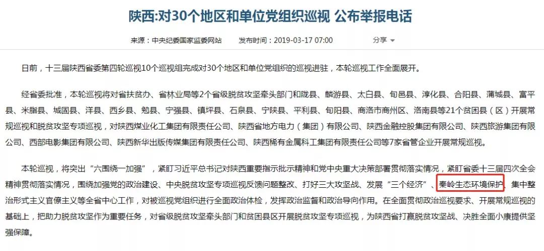 陕西开展秦岭生态环境保护专项巡视工作。 解说一下,不同于一般巡视多采取的常规巡视,这次是专项巡视,是针对秦岭生态环境保护的专项巡视。 在官方通稿中也提到了,这次专项巡视目的是督促各级党组织强化政治担当、采取有效措施,切实巩固秦岭北麓西安境内违建别墅问题专项整治成果。 关于秦岭北麓西安境内违建别墅问题的整治,大家已经比较熟悉,而今,又有了最新进展。 省委巡视和市级巡察结合 先说说这次专项整治。 日前,十三届陕西省委第五轮巡视10个巡视组分别进驻西安市、宝鸡市、渭南市、汉中市、安康市、商洛市和省发改委、省自然资源厅、省生态环境厅、省林业局,对上述地区和单位党组织开展秦岭生态环境保护专项巡视。 可以看到,巡视对象中有6个设区市和4个单位。我们知道,秦岭违建的问题主要是在秦岭北麓西安境内,当时西安段共有1194栋违建别墅被列为查处整治对象,所以,西安作为被巡视对象是理所当然。 秦岭主要经过陕西南部,包括西安在内,宝鸡、渭南、汉中、安康、商洛也都在陕西中南部,被官方称为是涉秦岭各市。 而且,一些城市在此前中央环保督察中也被指出在秦岭生态环境保护方面存在问题。 2018年11月3日至12月3日,中央第二生态环境保护督察组对陕西省第一轮中央环境保护督察整改情况开展“回头看”,督察组于2019年5月13日向陕西省委、省政府进行反馈。 反馈中提到,渭南市对秦岭采石生态破坏恢复治理工作部署推进不及时、不细致,大部分采石企业长期“停而不治,治不彻底”,治理任务仅完成14%。 宝鸡市水利、环保和保护区管理部门违规为位于秦岭细鳞鲑国家级自然保护区实验区的唐家河、范家台2个水电站项目出具审批意见,宝鸡市及陇县政府无视整改方案和自然保护区管理要求,将该项目作为2017年市县重点项目推进,导致细鳞鲑等物种生存环境遭到破坏。 值得注意的是,本轮巡视采取省委巡视和市级巡察相结合的方式进行。在巡视期间,被巡视的6个设区市党委统筹市县巡察力量成立巡察组,在省委巡视组指导下,对所辖秦岭区域18个县(市、区)开展秦岭生态环境保护专项巡视巡察联动。 “五落实一加强” 根据巡视公告内容,陕西省委巡视组将在被巡视地区、单位工作1个月左右。巡视期间设值班电话、邮政信箱、电子邮箱等,巡视组受理信访时间截止到2019年6月30日。 那么,巡视什么内容? 根据报道,这次秦岭生态环境保护专项巡视是对落实秦岭生态环境保护政治责任的再监督。重点围绕“五落实一加强”开展监督检查。 贯彻落实习近平生态文明思想特别是总书记关于秦岭生态环境保护重要指示批示精神和中央有关部署要求情况; 秦岭生态环境保护法规制度制定和贯彻落实情况; 党委、政府落实秦岭生态环境保护“党政同责”“一岗双责”情况; 纪委监委(纪检监察组)落实监督责任和相关职能部门落实监管责任情况; 中央环保督察及“回头看”和秦岭生态环境保护各类监督检查发现问题整改落实情况; 加强对秦岭生态环境保护体制机制共性问题的调查研究。 值得一说的是,就秦岭违建别墅问题,习近平总书记四年里作出六次重要指示批示,中央也多次作出部署。前文我们提到,今年5月13日,中央第二生态环境保护督察组对陕西省委、省政府进行反馈。 在反馈中提到: 一些领导干部对习近平生态文明思想学习领会不到位,重发展、轻保护的观念尚未得到有效扭转。 习近平总书记对秦岭违规建别墅问题先后作出6次重要批示指示,但陕西省、西安市在秦岭北麓西安境内违规建别墅问题上严重违反政治纪律、政治规矩,教训深刻,令人警醒。 2017年修订《陕西省秦岭生态环境保护条例》时放松要求,在适度开发区开发建设活动管理方面,以负面清单方式代替“划定建设控制地带”,并删除“巴山生态环境保护活动参照本条例规定执行”条款,致使与秦岭同为我国中部重要生态安全屏障的巴山生态环境保护无据可依。 2018年出台的秦岭生态环境保护总体规划,仅要求对列入国家重点生态功能区的19个县按照负面清单管理,对其他20个县的开发建设活动未作出规范。 省委首次专项巡视 这是陕西省委首次针对秦岭生态环保问题开展专项巡视,但其实在此前,秦岭生态环保问题已经出现在省委巡视中。 今年3月,十三届陕西省委第四轮巡视对省扶贫办、省林业局等2个省级脱贫攻坚牵头部门和陇县、麟游县等21个贫困县(区)开展常规巡视和脱贫攻坚专项巡视,对陕西煤业化工集团有限责任公司等7家省管企业开展常规巡视。 当时的巡视内容是“六围绕一加强”,“六围绕”就是指围绕加强党的政治建设、中央脱贫攻坚专项巡视反馈问题整改、打好三大攻坚战、发展“三个经济”、秦岭生态环境保护、集中整治形式主义官僚主义等全省中心工作。 大家看到了,“秦岭生态环境保护”就在其中。 秦岭的问题此前中央纪委也非常重视。在今年2月公布的十九届中央纪委三次全会工作报告全文中,提到了四大问题事件,首当其冲的就是秦岭北麓西安境内违建别墅问题。报告中说,坚持从政治纪律查起,彻底查处秦岭北麓西安境内违建别墅整而未治、阳奉阴违的问题,发挥警示教育作用。 可以看出,这次陕西省委开展专项巡视,也是对中央指示批示以及相关部署的重要落实。 来源:政知道 |