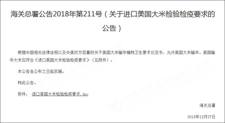 资料图:2017年10月,美国大米协会造访加利福尼亚州太阳谷大米公司 美国大米协会是一个旨在促进美国谷物销售的贸易组织,据该组织发言人迈克尔•克莱因(Michael Klein)介绍,上述中国进口商从加利福尼亚州太阳谷大米公司(Sun Valley Rice)采购了两个集装箱的中粒大米,重约40吨。 克莱因表示,这部分大米经过碾碎后打包成袋,供消费者和食品服务机构使用。 美国商务部上周称,美国将向中国出售544000吨大豆,为3月以来数量最多的一次。而对于本次中国商家购买美国大米,报道称,尚不清楚这是否表达了一种友好姿态。 中国是世界上最大的大米生产国和消费国,在2018/19农产品销售年度生产了1.485亿吨大米,进口了350万吨。同期,美国生产了710万吨大米,出口不足300万吨。 “贸易摩擦威胁第一笔交易” 据观察者网此前报道,在中美双方谈判十多年后,美国在2017年7月首次获准可对华出口大米。 中国商务部当时表示,美国大米对华开展贸易,还要完成以下法律步骤: