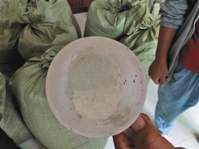 童桦从作坊内取出一些白色粉末。“这是焦亚硫酸钠,只要溶在水里,就有一股臭味,”童桦将焦亚硫酸钠洒在积水的地面,记者用手蘸水,凑到鼻子处,味道刺鼻。