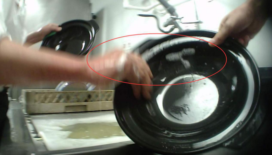 当得知有人来取砂锅时,该洗碗工将手里正在清洗的黑色砂锅递给暗访人员,上面还残留着很多洗涤剂的泡沫,在被质疑后该员工才用清水冲洗几下。接着又从旁边盛餐具的筐内拿起一个黑色砂锅,同样放在水龙头下冲洗了几下后也递了过来。