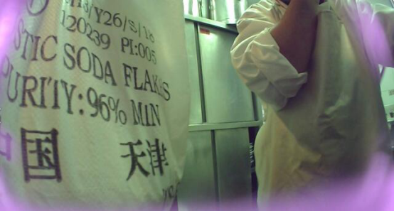 当暗访人员询问该工业碱的用途时,工作人员称这是火碱,用来清洗蒸箱里的篦子。