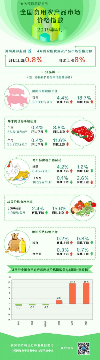 本网5月15日综合讯 据商务部监测,4月份全国食用农产品市场价格指数环比上涨0.8%,同比上涨8%。 来源:商务预报 从主要品种来看: 猪肉价格继续上涨,4月份36个大中城市猪肉平均批发价格为每公斤20.83元,环比上涨4.4%,同比上涨18.7%。 牛羊肉价格小幅回落,牛肉平均批发价格为每公斤56.61元,环比下降0.4%,同比上涨8.8%;羊肉平均批发价格为每公斤55.22元,环比下降0.4%,同比上涨11.6%。 禽产品价格小幅波动,鸡蛋平均批发价格为每公斤8.45元,环比上涨4.2%,同比下降1.2%;白条鸡平均批发价格为每公斤16.29元,环比下降0.1%,同比上涨2.6%。 蔬菜价格有所回落,30种蔬菜平均批发价格为每公斤4.96元,环比下降2.4%,同比上涨15.6%。 粮油价格总体平衡,粮食、食用油批发价格环比分别上涨0.2%和0.3%,同比分别下降0.8%和0.7%。 |