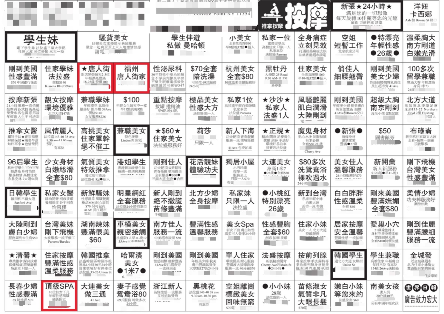 常常,这场冒险的起点,是美国中文报纸《世界日报》上活色生香的一整版“按摩”广告。每天,上面都密密麻麻地铺满近百个电话,这些说自己来自东北、湖南、四川、重庆和台湾的妹子,配上垂延欲滴的性挑逗广告语,足以抓住每一个第一次看见这个版面的人。我对着这些温柔性感的号码打电话,有时迎来破口大骂“你不要给我发短信,我老公和孩子都会看见”;有时迎来冷漠的“打错了”;有时只是很简短的“我要回国,不接受采访”;或者我刚说完“记者”两个字,电话就嘟——。