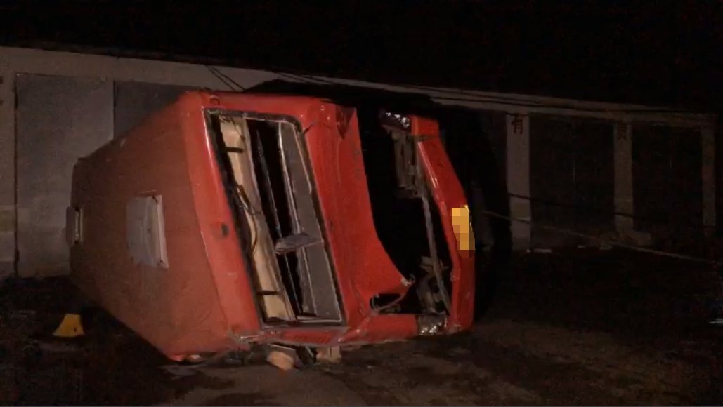 一辆客车在龙卷风中被吹翻在地。 来源:新京报即时新闻