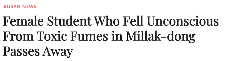 海外网10月4日电 今年7月,韩国釜山一名19岁女学生在公共厕所吸入“臭气”而昏迷,警方证实,她在入院治疗近两个月后,最终于9月27日离世。医院方面表示,这名女学生死于硫化氢中毒引起的缺氧脑损伤。