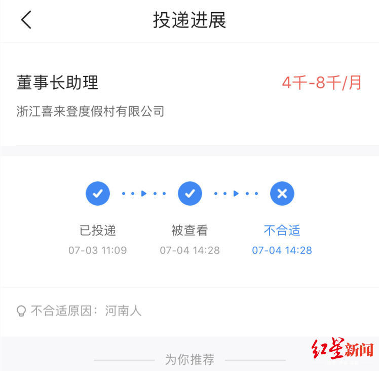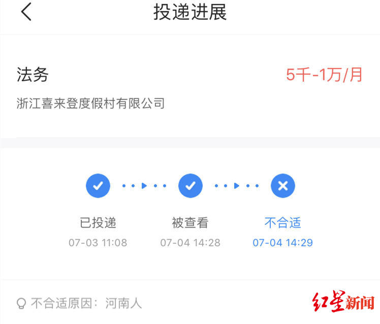 河南女孩小闫说,2019年7月,她向浙江喜来登度假村有限公司两个岗位投递了简历,第二天被该公司拒绝。小闫提供的相关材料显示,“不合适原因”一栏上写着“河南人”三个字。 ↑被公司认为不适合原因:河南人 小闫告诉红星新闻,2017年,她从一所政法类学校毕业,今年年初,她准备到浙江杭州发展,7月3日,便通过某招聘平台,向浙江喜来登度假村有限公司提交应聘公司法务或董事长助理两个岗位的简历材料。7月4日,该公司向小闫发出不适合此岗位的通知,原因都为“河南人”。 “当时,我看到这个拒绝理由挺懵的,从来没想到理由居然是这个,又看了一下招聘条件,没有提到地域限制。”该公司的拒绝理由让小闫不能理解,“很伤人,我把这件事告诉了一个同学,他也认为我就业遭到了地域歧视,鼓励我起诉这家公司。” ↑被公司认为不适合原因:河南人 小闫于是发起诉讼。11月1日接受红星新闻记者采访时,其代理律师、浙江丰国律师事务所律师王旭山认为,该公司的做法明显违反了《劳动法》第十二条“劳动者就业,不因民族、种族、性别、宗教信仰不同而受歧视”和《就业促进法》第三条“劳动者依法享有平等就业和自主择业的权利。劳动者就业,不因民族、种族、性别、宗教信仰等不同而受歧视”等规定,侵犯小闫的平等就业权,应当赔偿由此给小闫造成的财产损失和其他损害。 小闫提供的民事起诉状内容显示,其诉求包括:判令该公司向小闫口头道歉,并自判决生效之日起连续15日在《人民日报》、《河南日报》、《浙江日报》上向小闫登报道歉,支付精神抚慰金人民币6万元等。 2019年8月8日,杭州互联网法院决定受理此案。 王旭山告诉红星新闻,案件原定于11月7日上午开庭,因属新型案件,法院通知本案目前将由简易程序转为普通程序,开庭日期会有相应变动。红星新闻从杭州互联网法院处了解到,该案开庭的具体时间待定,暂不接受媒体采访。 红星新闻记者多次致电该公司,均无人接听,据当地媒体报道,该公司律师表示,将通过诉讼途径处理此事,不方便接受采访。 来源:红星新闻 |
