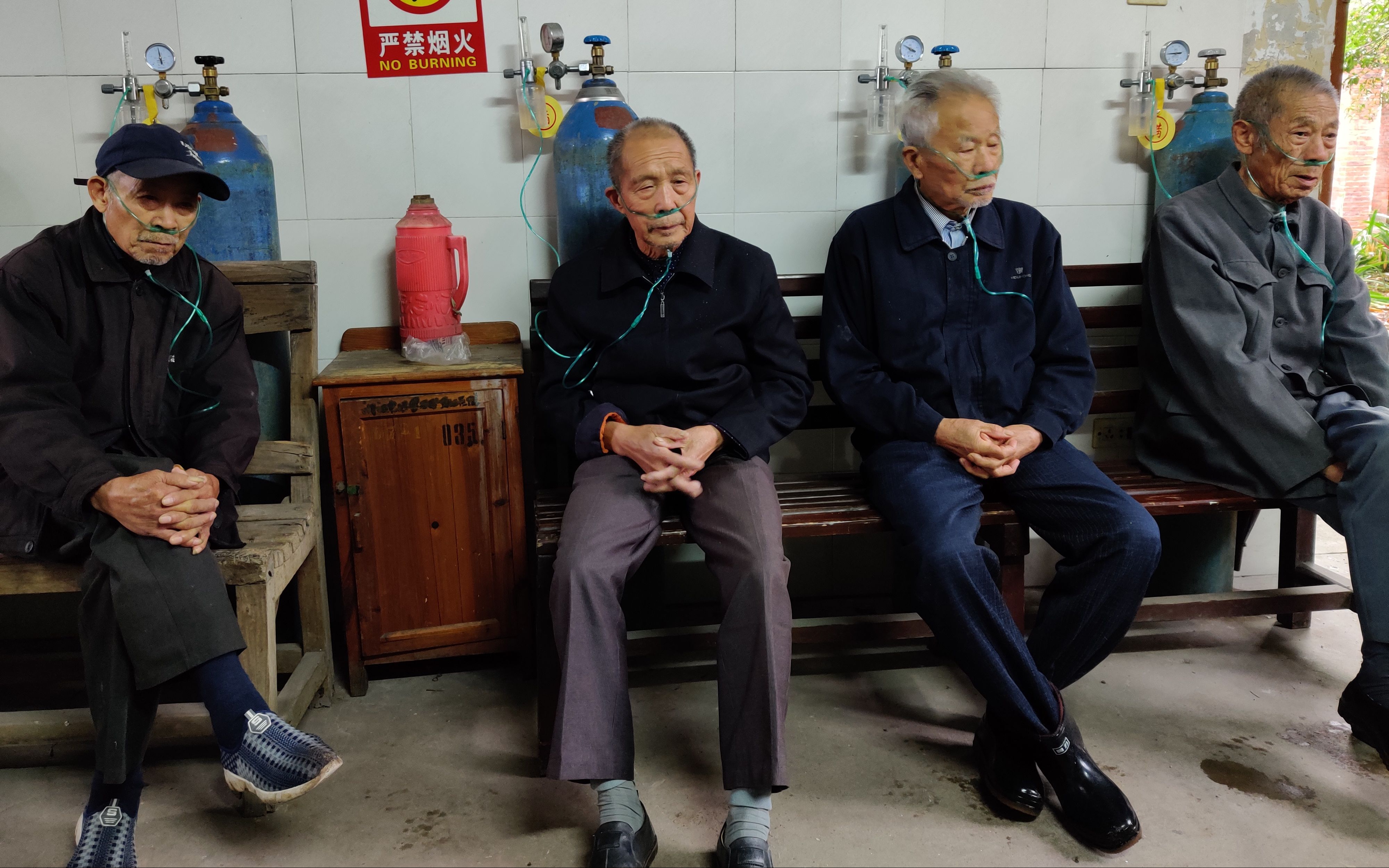 中间住院楼一层的308房间陆陆续续来了一些住在二层的病人。他们掏出口袋里的吸氧管,或是在抽屉里翻出自己之前留下的,接在氧气罐上。阀门拧开、氧气管套上,病人们坐在氧气罐前的长条板凳上,间或交谈。搬运氧气罐的工作是医院清洁工兼职,只能为一层的病房更换。病情相对轻微的病人于是就住在二层。像是约定过一样,每天上午8点到9点,二层病人及一些没有住在医院的病人就在这个308里“聚众吸氧”。