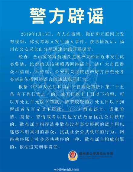 人民日报市场报《时事经济观察》1月16日综合讯 据人民网消息:1月15日晚,福州市公安局仓山分局发布通报称,当日有人在微博、微信和互联网上发布视频宣扬“爱琴海发生捅人事件”,经调查,该视频系网络谣言。 1月15日,微博、微信朋友圈流传了一段视频,发布者称“福州爱琴海商场发生捅人事件”,引发群众恐慌。 获悉情况后,福州市公安局仓山分局对此开展调查。经查,金山爱琴海商场及尤溪洲大桥附近未发生此类警情,现场与视频中场景有较大出入,比对后确认该视频系网络谣言。 警方提示:请广大市民群众不信谣,不传谣,公安机关将依法严厉打击查处各类制造传播网络谣言的违法犯罪行为。 根据《中华人民共和国治安管理处罚法》第二十五条,有下列行为之一的,处五日以上十日以下拘留,可以并处五百元以下罚款;情节较轻的,处五日以下拘留或者五百元以下罚款:(一)散布谣言,谎报险情、疫情、警情或者以其他方法故意扰乱公共秩序的。散布谣言指捏造并散布没有事实根据的谎言用以迷惑不明真相的群众,扰乱社会公共秩序的行为。网络秩序属于社会公共秩序的一种,散布谣言构成犯罪的,依法追究刑事责任。 |