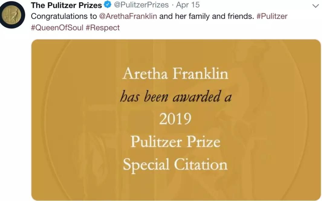 已故歌手弗兰克林获得普利策特别奖。推特截图