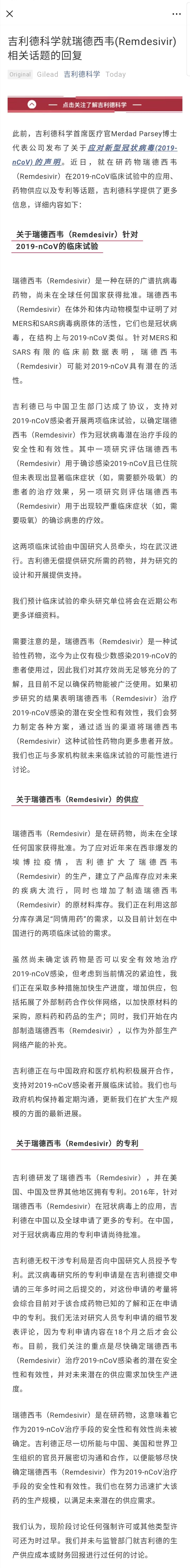 针对在研药物瑞德西韦(Remdesivir)对于新冠病毒的临床试验及专利申请等话题,瑞德西韦研发企业吉利德公司2月8日通过微信公众号“吉利德科学”(认证主体:吉利德(上海)医药科技有限公司)进行集中回应。 瑞德西韦用于新冠肺炎治疗的两项临床试验正在进行。吉利德公司介绍说,两项临床试验由中国研究人员牵头,均在武汉进行,预计临床试验的牵头研究单位将会在近期公布更多详细资料。 吉利德公司表示,虽然尚未确定该药物是否可以安全有效地治疗新型冠状病毒感染,但考虑到当前情况的紧迫性,正在采取多种措施加快生产进度,增加供应。 其表示,吉利德无权干涉专利局是否向中国研究人员授予专利。武汉病毒研究所的专利申请是在吉利德提交申请的三年多时间之后提交的,对这份申请的考量将会综合目前对于该合成药物已知的了解和正在申请中的专利。 来源:新京报 |