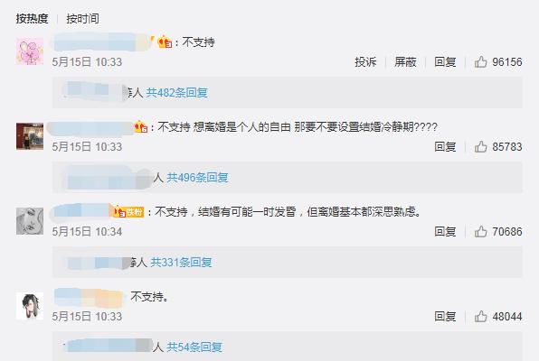 值得注意的是,近期微博上发起了一项关于“民法典草案拟引入离婚冷静期,你支持吗?”的投票,引来了上万人的评论与转发,但大多数的网友均表示“不支持”。