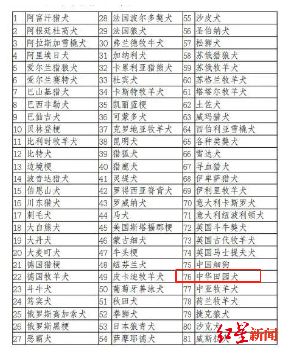 拟定的《四平市禁养犬名单》(征求意见稿)在公开的拟禁养犬名单中,红星新闻记者注意到,该名单将81个大型或烈性犬种纳入禁养范围,其中,中华田园犬位于第76个。