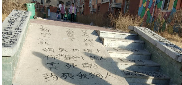 四平市东方居小区一狗主人‘涂鸦’诅咒下药毒狗的人 受访者供图王先生说,此前东方居小区有业主养狗不规范,后来狗被人偷偷下药毒死,狗主人便在小区到处“涂鸦”诅咒下毒的人。此外,“小区还经常有流浪狗(中华田园犬为主)出入,不仅犬吠扰民还到处便溺,有关部门对这种事的管理力度不强。”